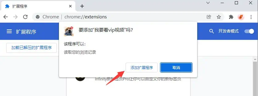 松开鼠标,浏览器弹出提示“要添加 XXX 插件吗”,点击【添加扩展程序】。