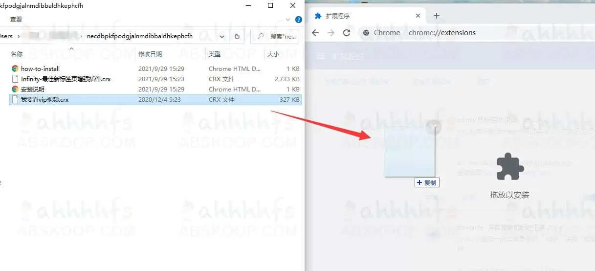 为了便于拖拽,可以将浏览器窗口缩小,露出部分电脑桌面。然后,将解压后的文件夹中的【插件名.crx 】,拖拽到谷歌浏览器的扩展管理页面。