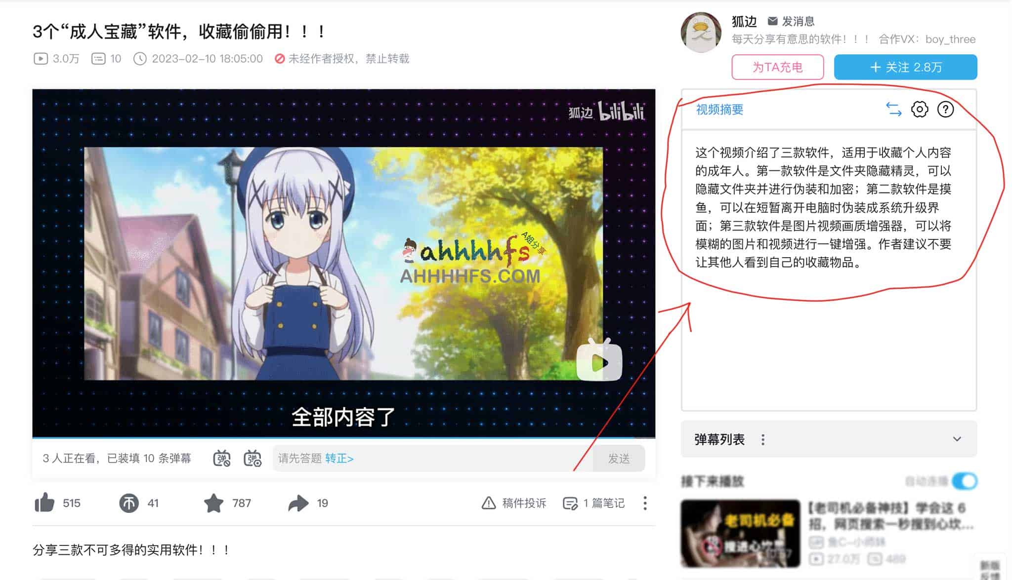 BilibiliSummary,一个浏览器扩展插件,能够一键获取B站视频摘要,告诉你视频的主要内容和重点,基于ChatGPT,支持中文视频,使用也简单,登录B站,点击视频,然后点击插件图标(在视频右侧),插件会在5秒内分析视频内容,自动生成一个简短但详细的视频摘要。你可以根据自己的需要选择观看整个视频或只是快速浏览摘要,不过需要你有访问ChatGPT的网络环境和ChatGPT账号。