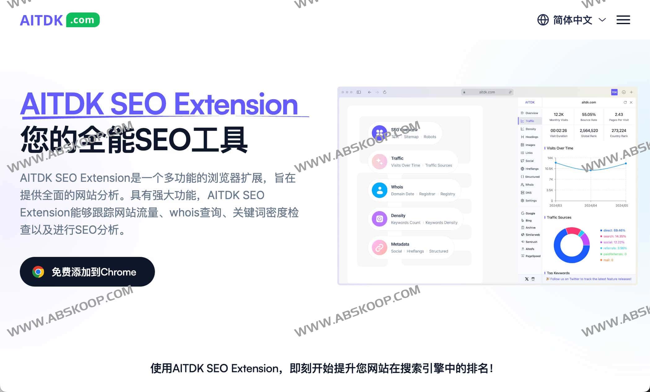 AITDK SEO Extension是一款免费的 All-in-One SEO 插件,你的全能SEO工具。当分析某个网站的访问量/Whois/关键词/SEO 等信息时,经常需要打开多个插件或多个网站,非常低效。使用 AITDK SEO Extension,可以一键快速查看网站的访问量/Whois/关键词/SEO 等信息,分析网站常用的功能都有了,而且完全免费。