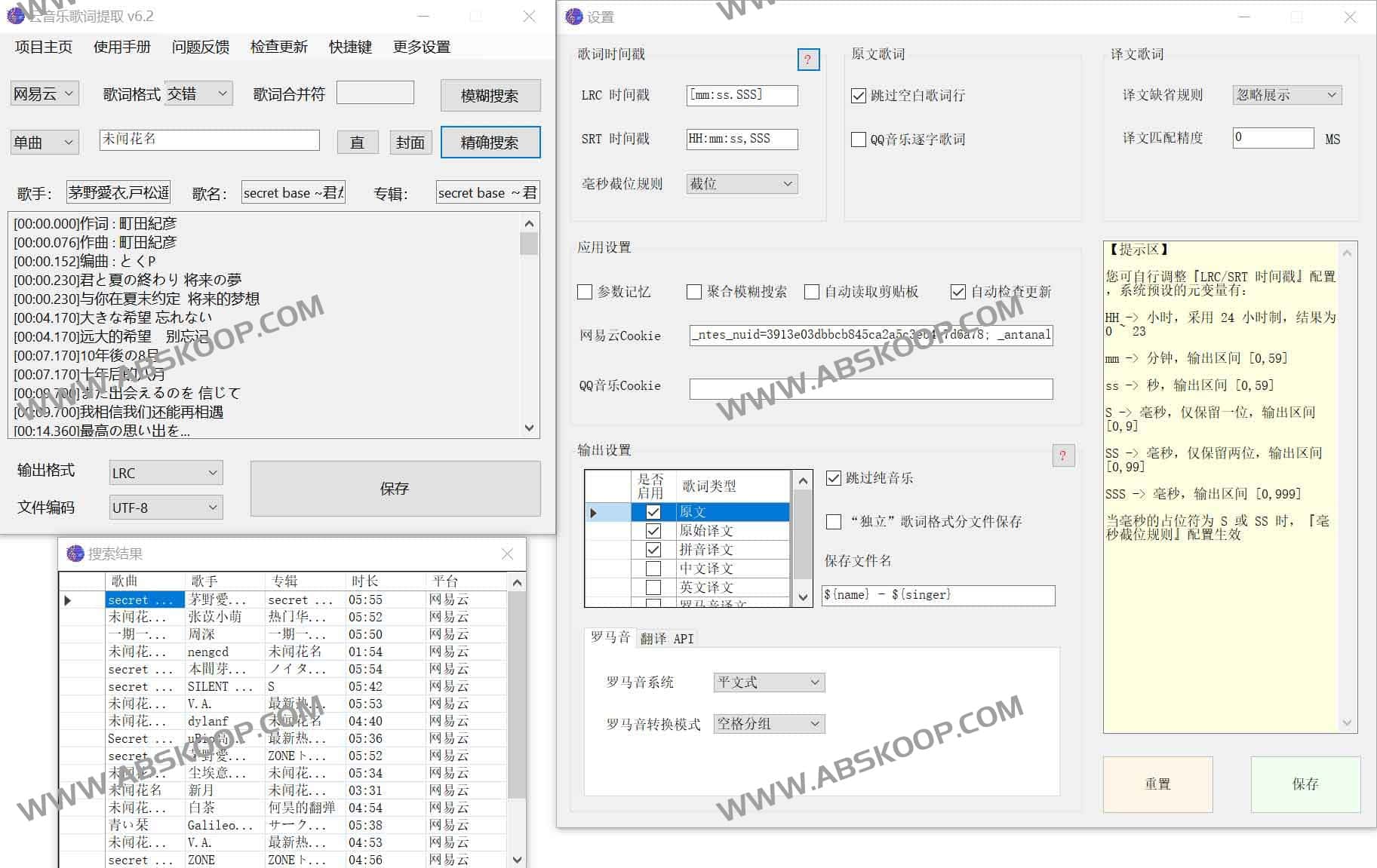 163MusicLyrics是一款适用于Windows的免费歌词下载软件工具,支持通过网易云音乐、QQ音乐两家音乐提供商歌词获取下载,可通过ID、完整链接或关键字查询下载;支持批量查询和硬盘扫描;提供多种歌词原文、译文的组织方式,并可使用百度翻译和彩云小译API进行歌词翻译,支持中文拼音和日文罗马音歌词;支持提取歌曲试听链接、文件编码格式、文件名自定义以及LRC和SRT输出格式,且QQ音乐支持逐字歌词模式(卡拉OK模式)。