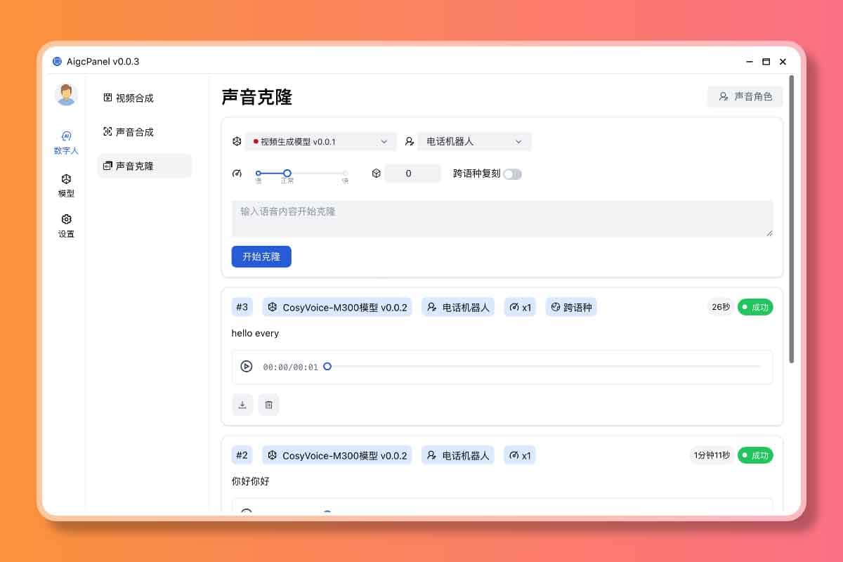 - 支持语音合成、语音克隆,多种声音参数可设置