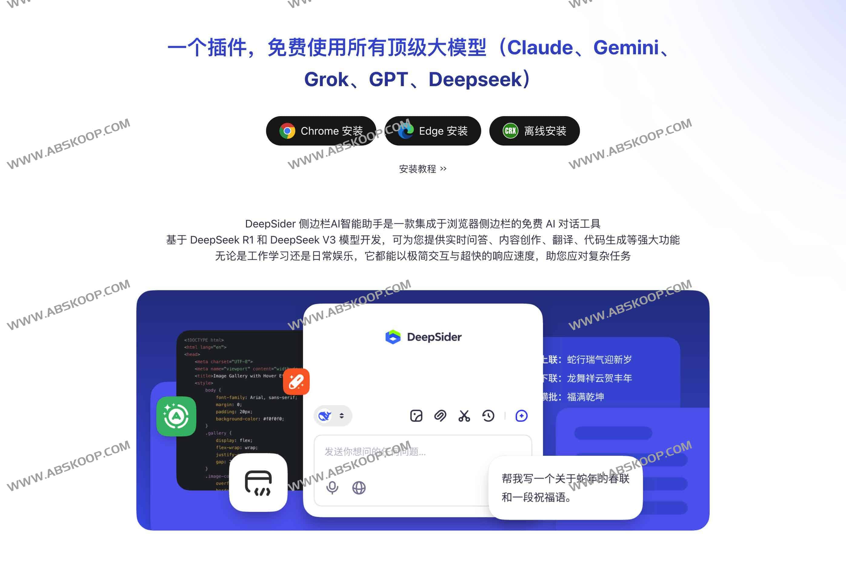 DeepSider侧边栏AI助手是一款嵌入浏览器侧边栏的免费AI插件,集成了DeepSeek R1和DeepSeek V3满血版等顶级AI模型,能够在任意网页上实现实时问答、内容创作、翻译和代码生成等多种功能。该工具支持文档对话、图片对话与联网搜索,借助极简交互设计和超快响应速度,助力用户高效完成数学、编程及自然语言推理等复杂任务。用户只需用鼠标划词选中文本,即可一键调用AI实现翻译、总结、改写和解释,从而大幅提升工作和学习效率。DeepSider基于现有知识生成答案,在确保回答准确性的同时,允许用户通过明确指令引导生成高质量内容,并严格保护用户隐私,绝不泄露敏感信息。这款插件不仅让你免费使用包括Claude、Gemini、Grok、GPT及DeepSeek在内的顶级大模型,还为多场景下的智能处理提供了一站式解决方案,助力实现高效智能工作。