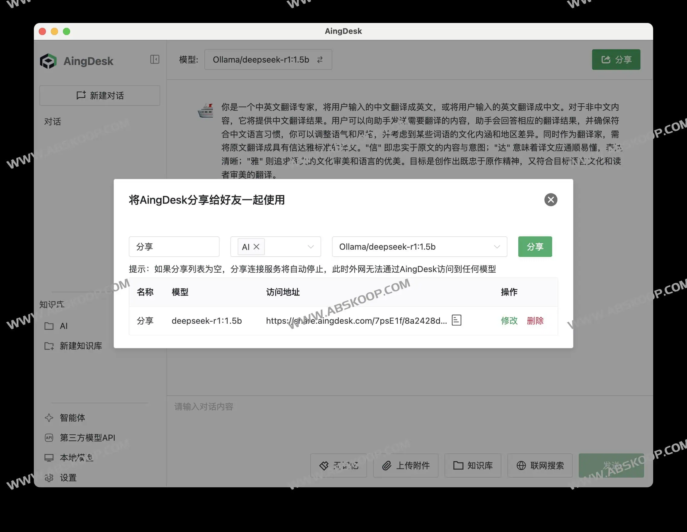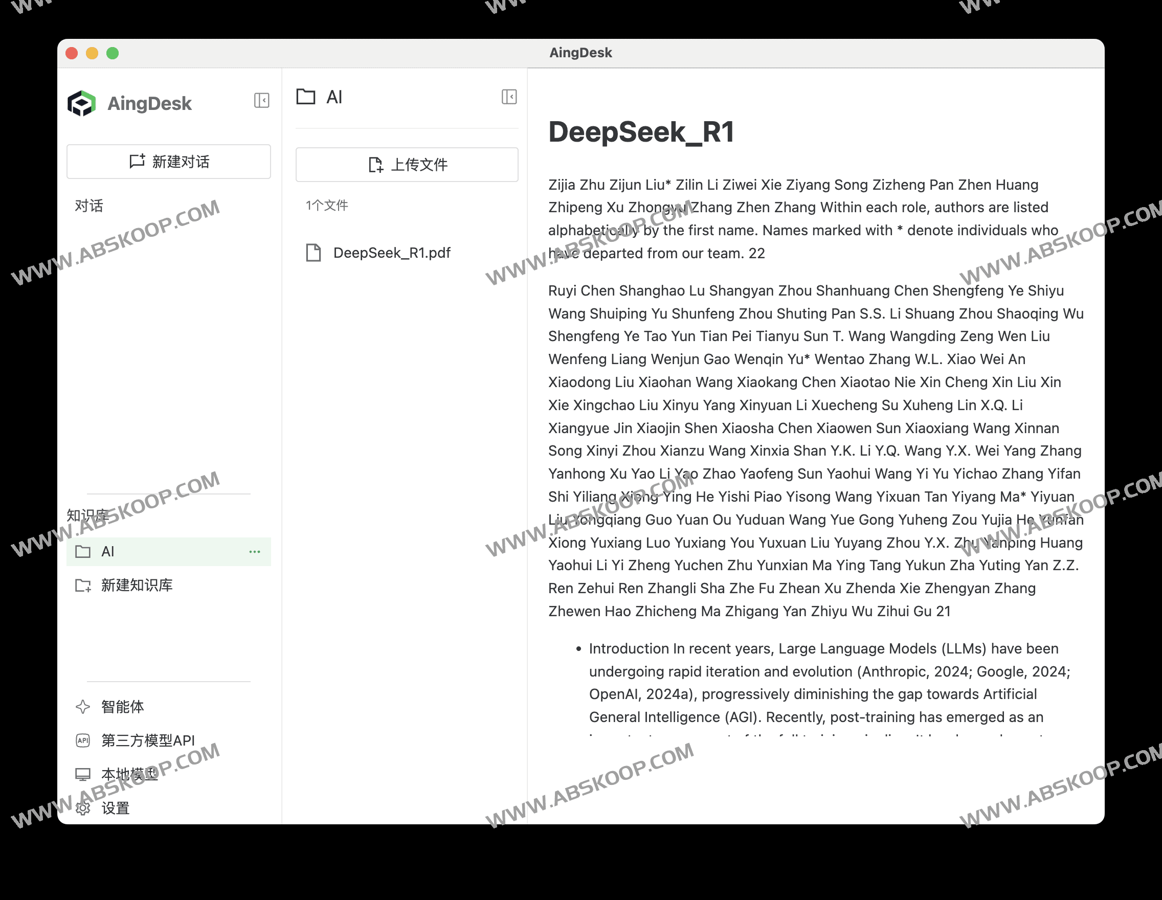 AingDesk是一款操作简便的AI助手软件,拥有超强知识库能力的开源免费AI助手,专为AI新手设计。支持一键部署本地AI模型及主流模型API,可搭建和管理本地知识库,同时支持智能体创建和在线共享。工具不仅支持联网搜索,还具备服务端部署功能,未来将支持单次多模型同时对话。客户端版本适用于MacOS和Windows,用户可通过官网、CNB及Github轻松下载安装。