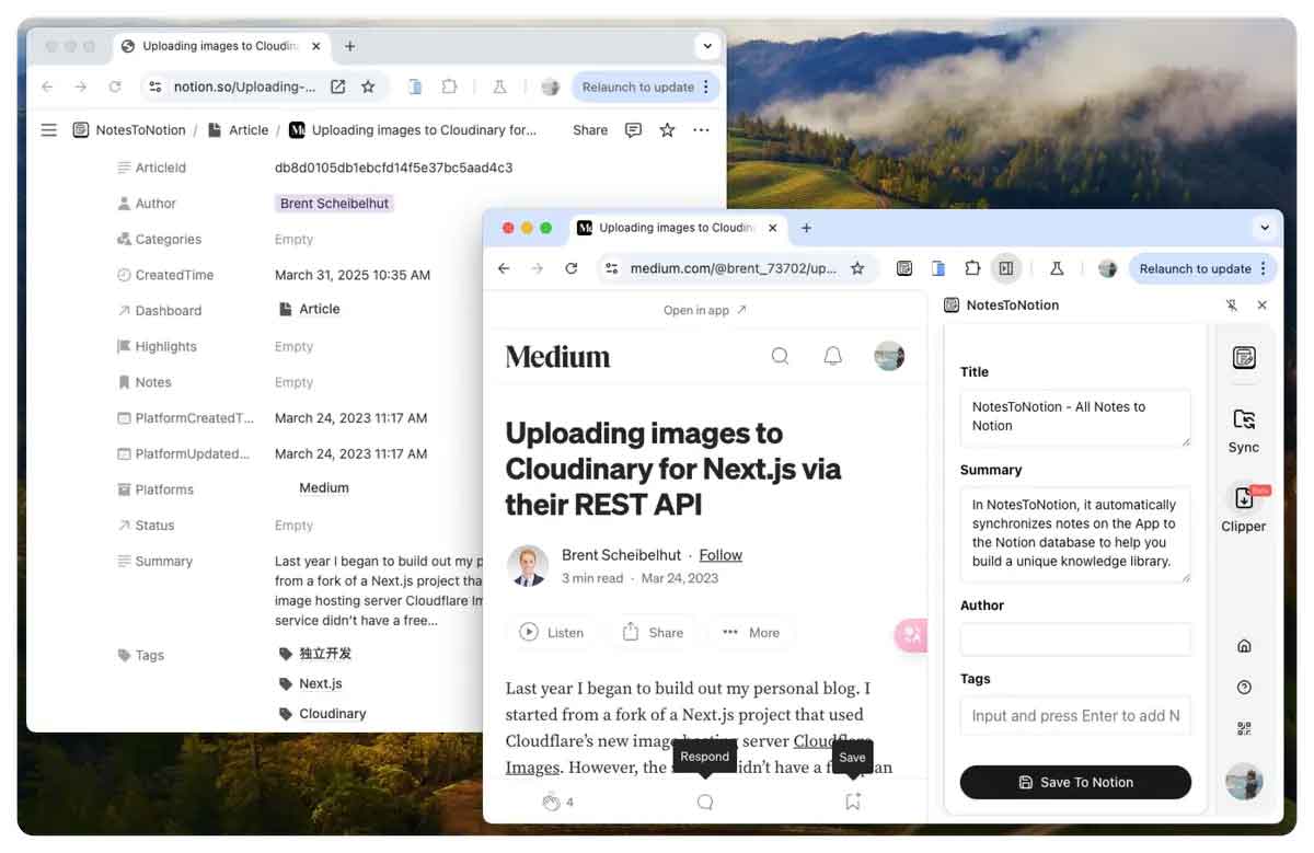 NotesToNotion 是一款基于 Chrome 浏览器扩展插件的Notion知识库收集管理神器,可将应用收藏与网页内容自动或手动同步到 Notion 数据库中,帮助用户集中管理笔记、文章、视频等多种形式的知识资源。该插件内置价值 19.9 美元的 Notion 模板,用户打开应用后即可实现内容自动同步,无需手动刷新,使收藏与动态保持与 Notion 实时更新的状态。