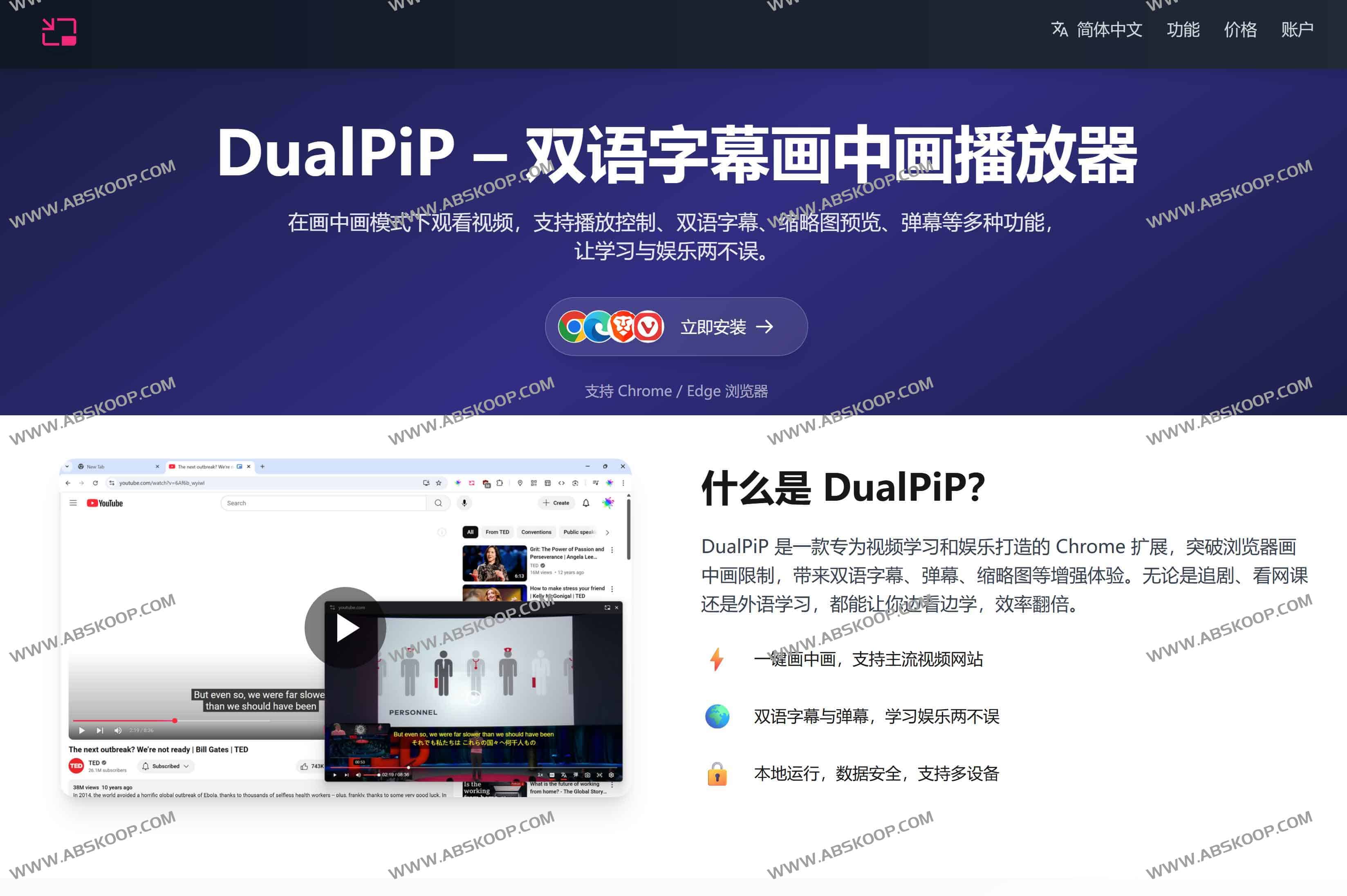 DualPiP 是一款专为 Chrome 浏览器设计的增强型画中画扩展工具。它突破原生浏览器画中画功能的限制,让用户能在悬浮窗口中自由操控视频,同时集成双语字幕、弹幕互动与精准预览等创新特性。无论是追剧、上网课或语言学习,都能实现多任务高效处理。