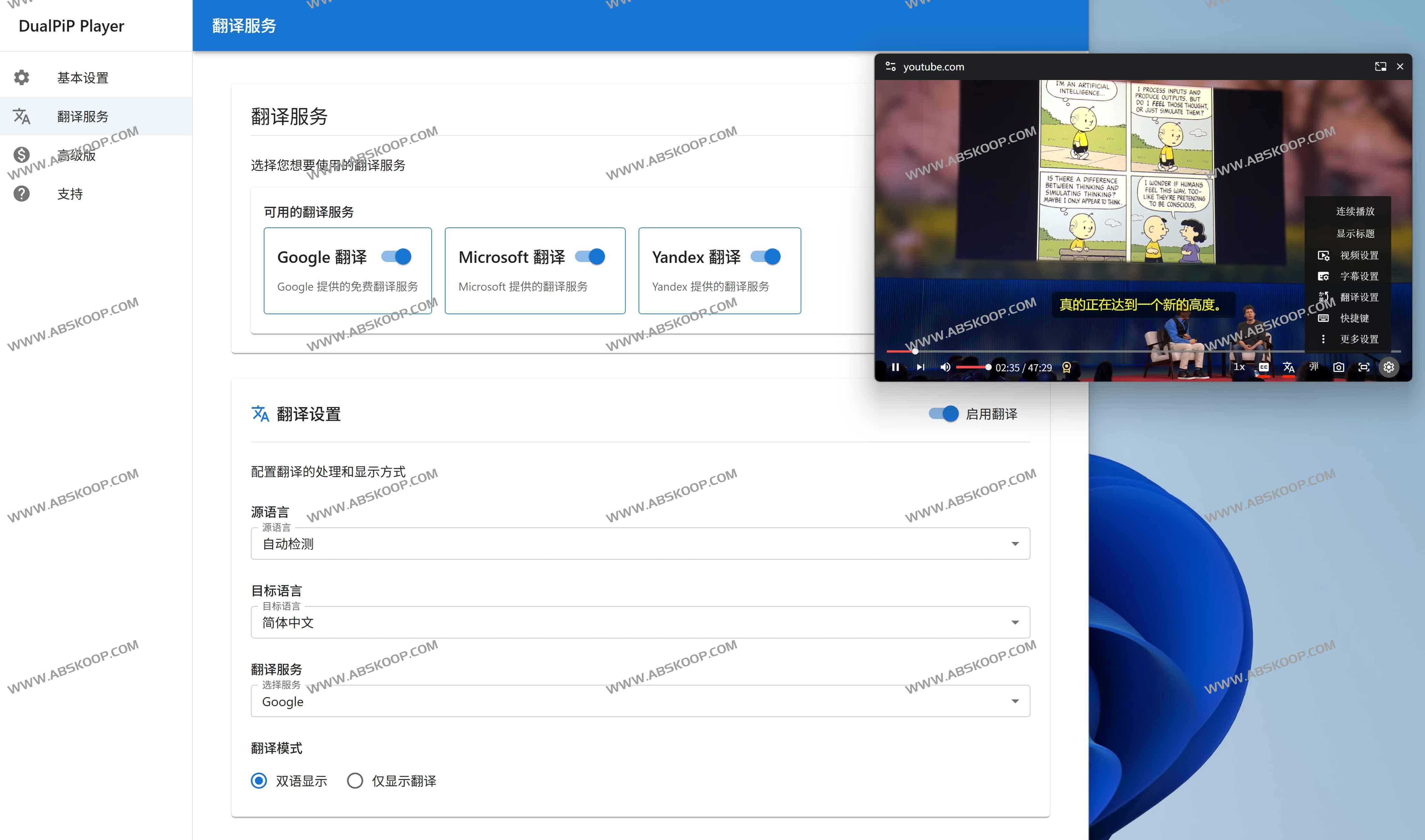 自动识别视频字幕,联动 Google、Microsoft、Yandex 三大翻译接口,实时生成对照双语文本。