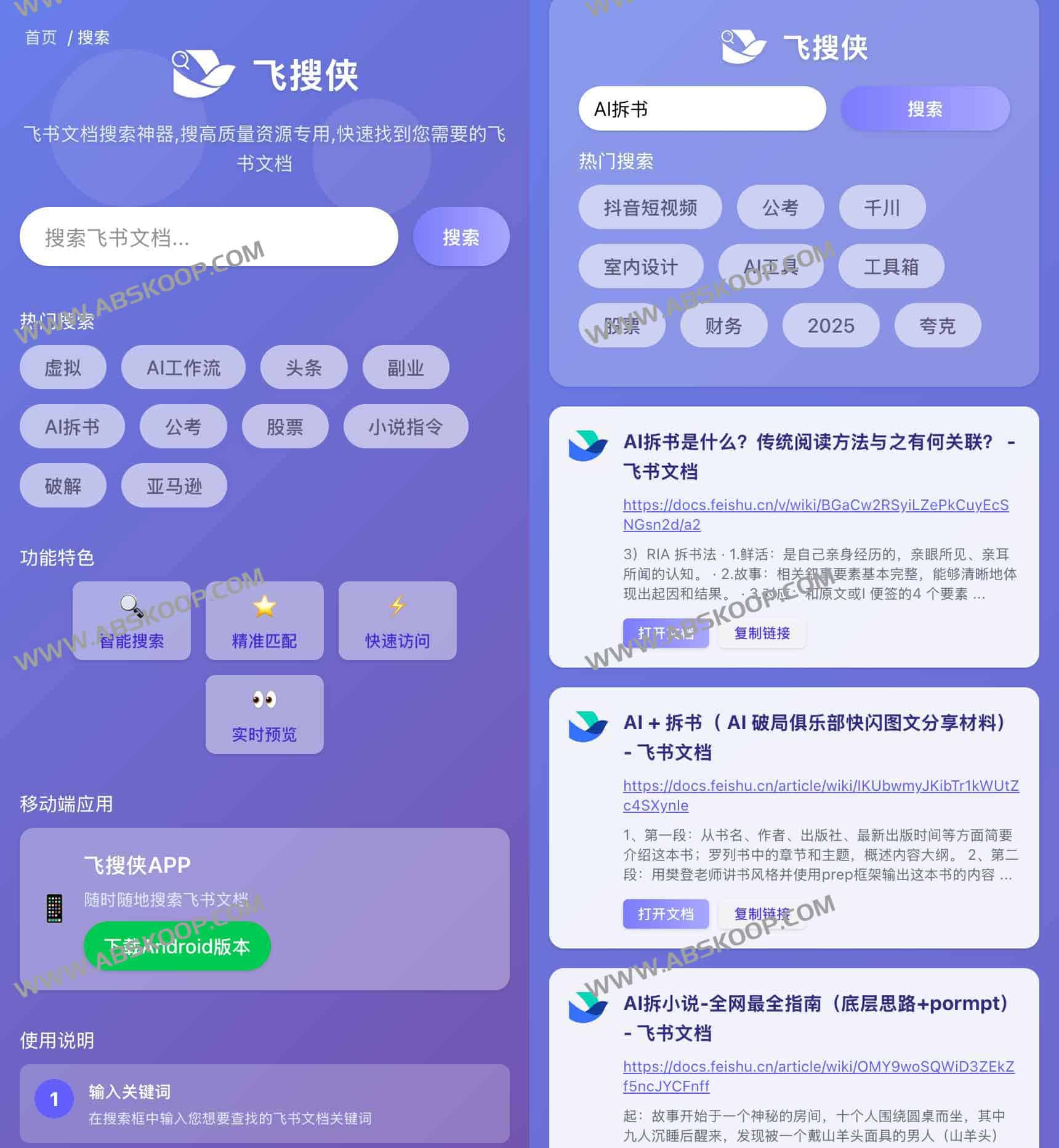 - 公共文档难发现:许多优质飞书笔记对外开放,却因缺乏索引工具而被淹没;飞搜侠利用关键词匹配与公开链接聚合,直接呈现相关结果。