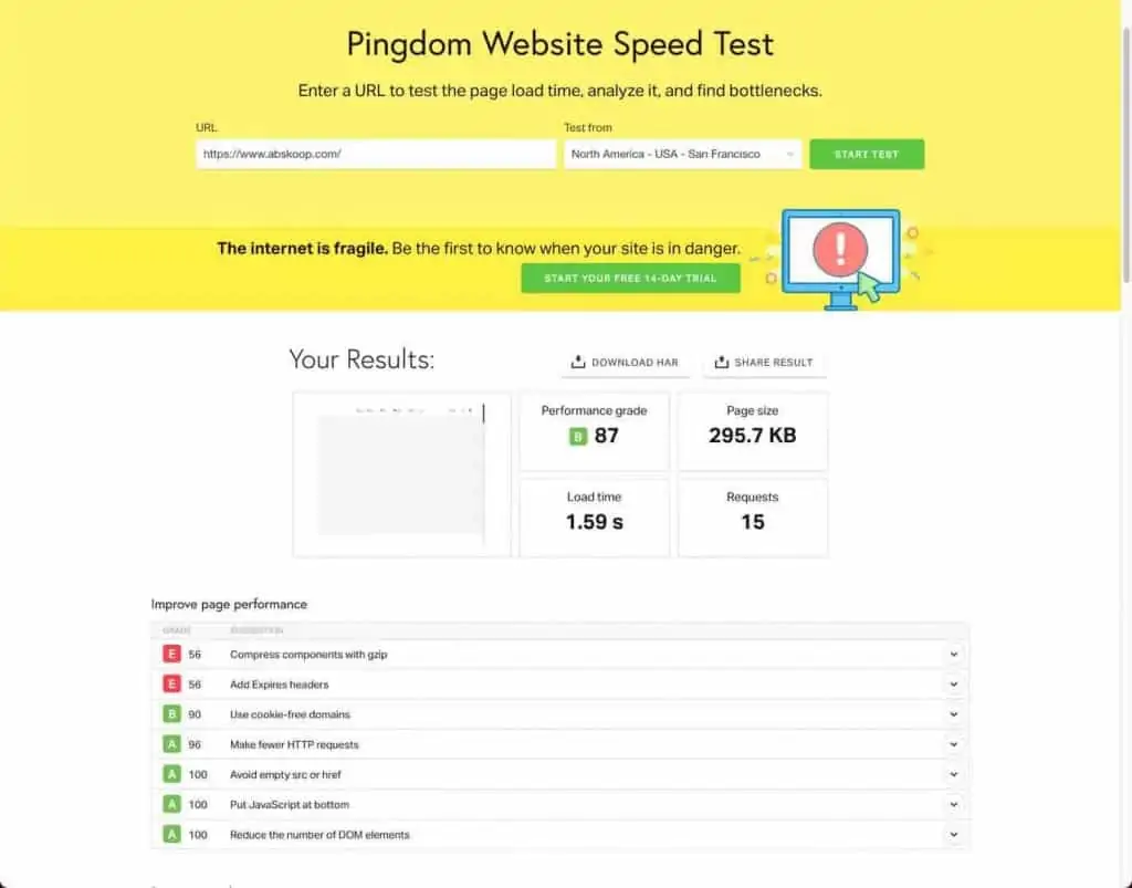 Pingdom是全球知名的网站测速工具之一,可以从北美,欧洲,澳洲的4个节点为你提供网站速度测试,该工具除了会对网站进行一个等级评分,还会给出网站在这些测试节点打开需要多长时间,让你对你的外贸网站速度有一个更直观的了解。