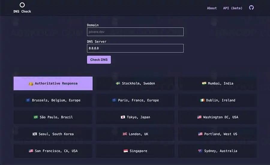 DNS Check是一个免费线上DNS 纪录查询服务,输入要查找的域名和DNS 服务器(预设为Google Public DNS)就会显示不同国家的纪录查询结果,包括欧洲、美国和亚洲等区域,也会显示从网址NS 纪录取得的权威回应(Authoritative Response)。