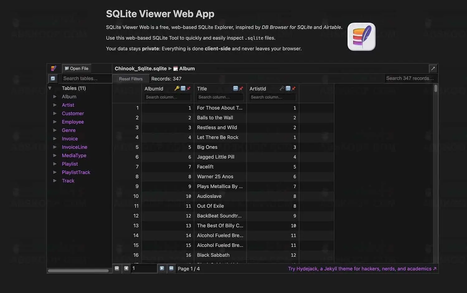 SQLite Viewer Web 是一个免费的、基于 Web 的 SQLite Explorer(SQLite 查看器),灵感来自DB Browser for SQLite和Airtable。使用这个基于 Web 的 SQLite 查看器可以快速轻松地检查.sqlite文件,一切所有数据都在客户端完成,永远不会离开你的浏览器。