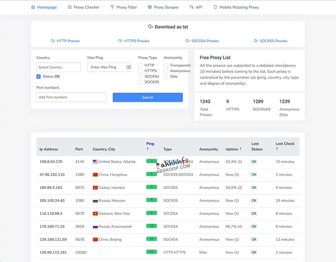 ProxyScan代理扫描器,提供免费代理,支持的类型有HTTP 代理、HTTPS 代理、SOCKS4 代理、SOCKS5 代理,全球任意国家切换使用,有代理的可用状态检测,支持在选筛选打包下载,还支持api使用。