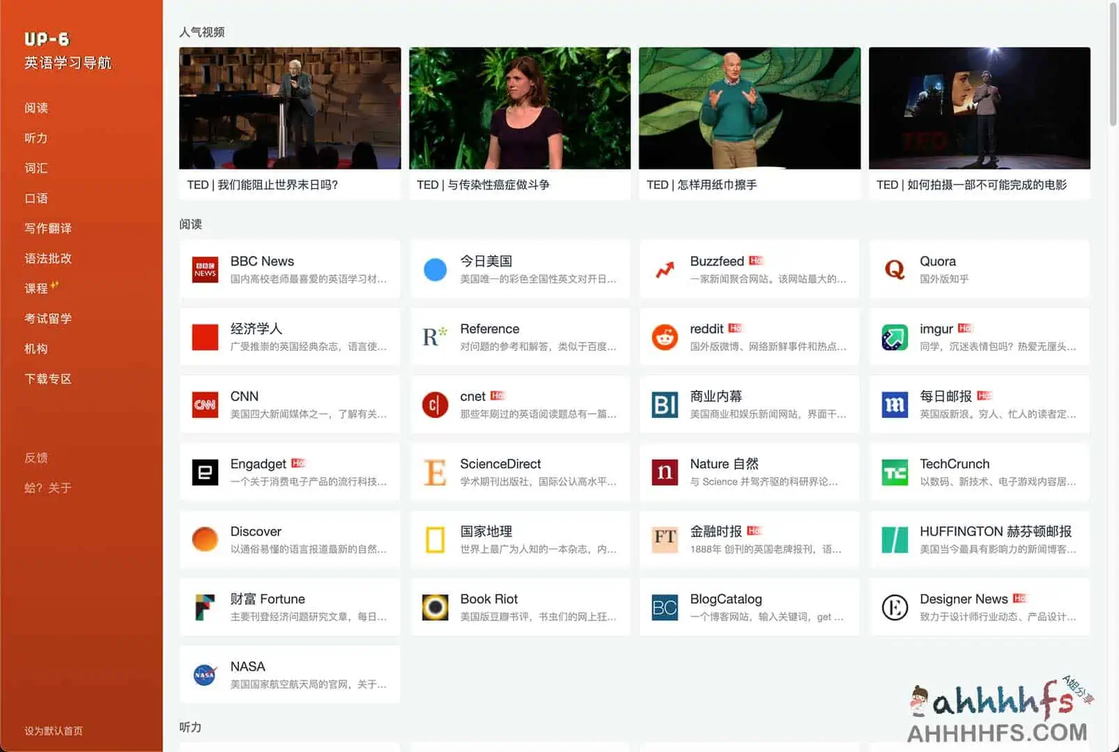 UP-6是一个英语学习导航,汇集了国内外英语学习最前沿的站点,站点非常丰富和齐全,A姐发现该站同时收录了词汇、听力、口语、阅读、写作、翻译、出国留学、考试、课程、下载等各种分类的优质网址,有学习英语兴趣的可以前往看看。